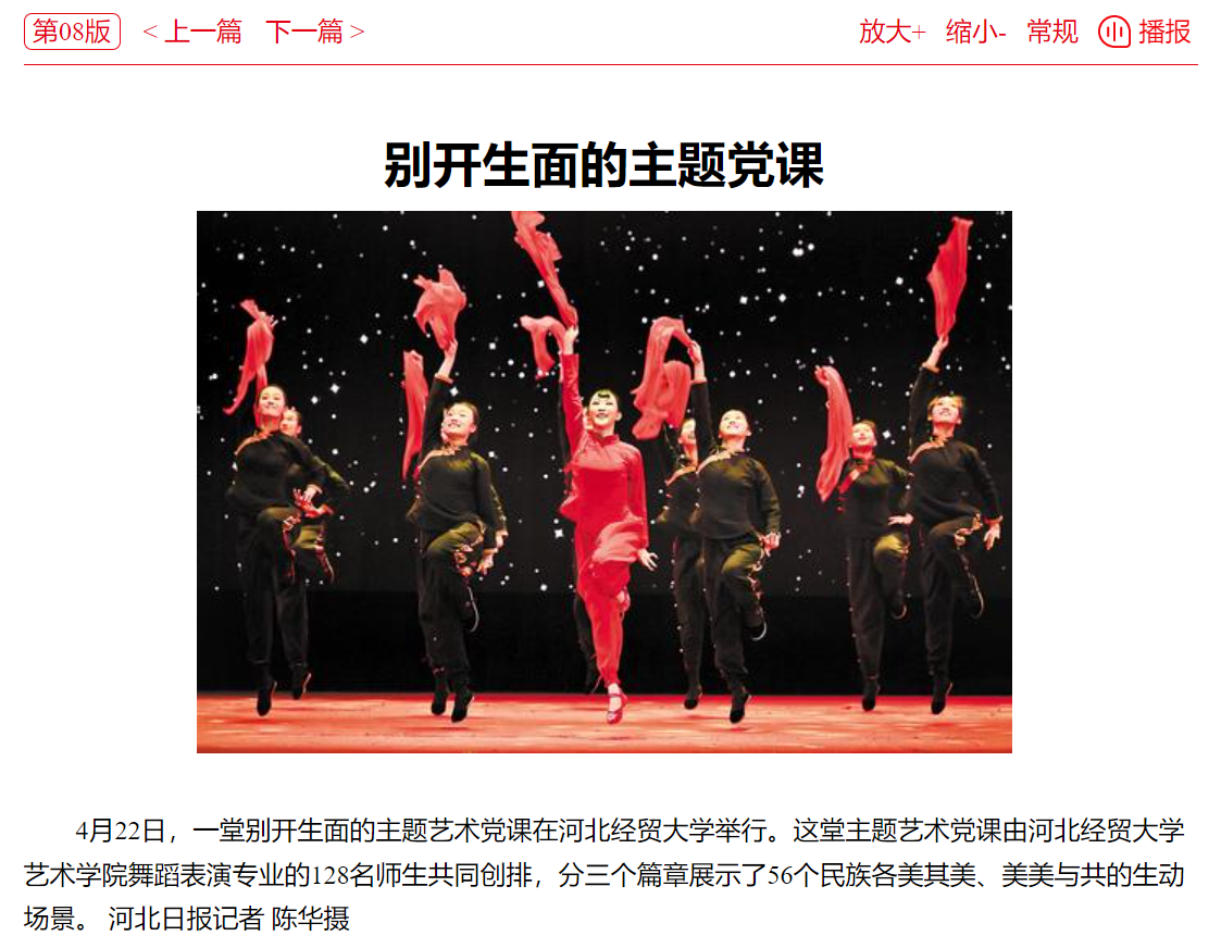 4月22日,公司排演的习近平文化思想主题艺术党课之舞蹈交响《纯熙·和韵》在校礼堂精彩上演。河北日报、河北新闻网、学习强国等多家媒